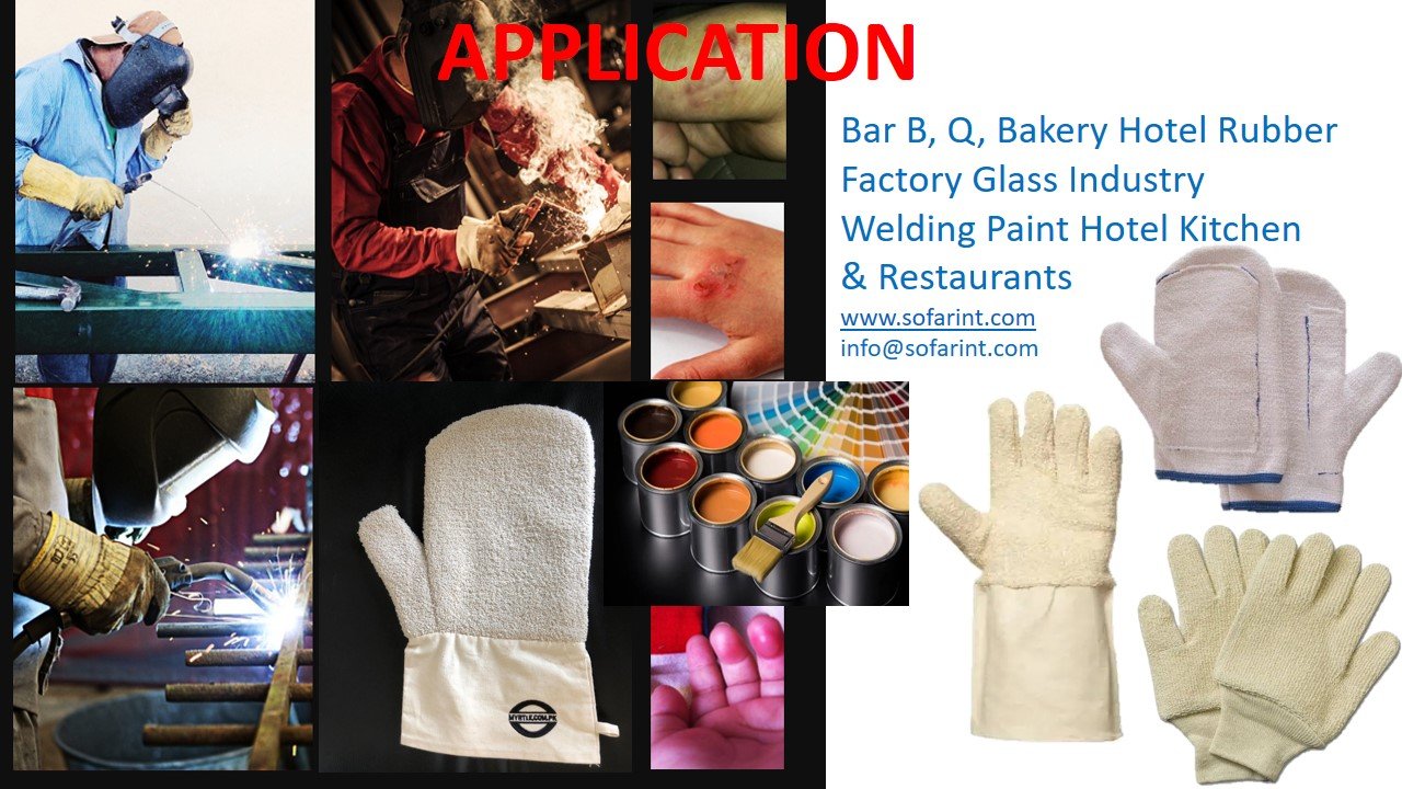 Sofar International are manufacturing the terry gloves & terry mittens in 100% cotton terry fabric in different GSM Weight according the client requirement. Cotton Terry Fabric is soft, absorbent and gentle on your skin and Protect your hands from injuries and heat. Terry cloth gloves provide comfort and protection. Achieves top level tear resistance for scrape protection. Offers heat resistance and barrier protection. Resists contact temperatures up to 250 to 350°C. Application: Welding, Bakery, Mechanical, Hotel, Glass Factories, Bar B.Q, Restaurants. Can be washed to maintain hygiene.
