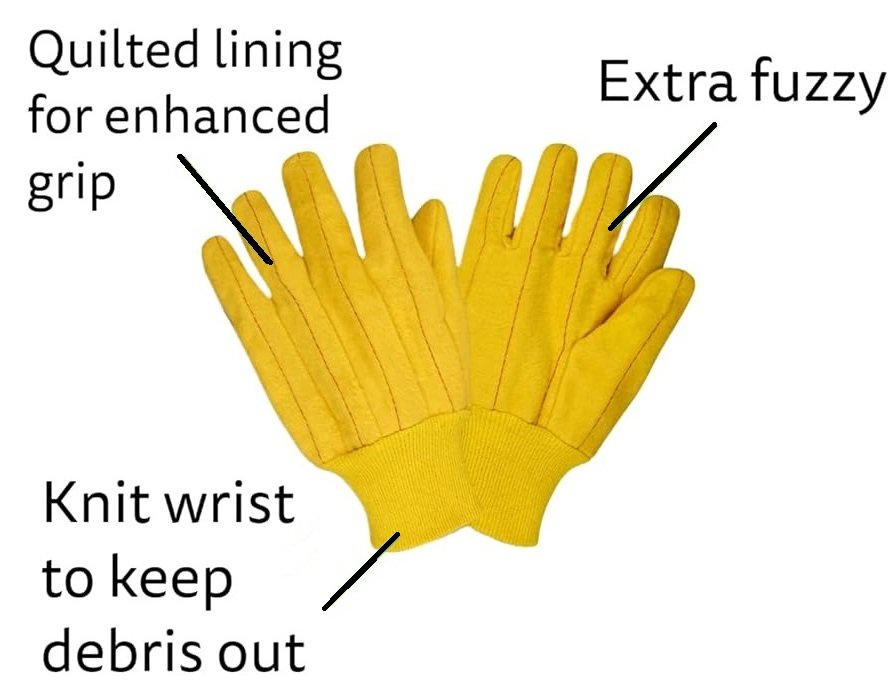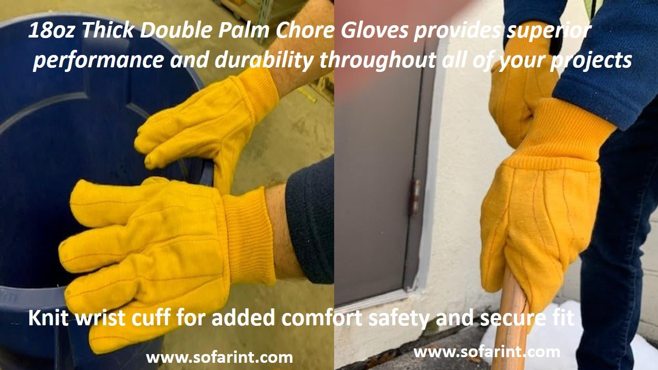 Double Palm Chore Gloves are constructed with a yellow cotton brushed fabric and breathable, Providing excellent flexibility, comfortability and durability on the job. The Chore Gloves feature a knit wrist, straight thumb, and nap out palm design to protect yourself on the job. Clute cut pattern with straight thumb Yellow Chore Gloves Red Quilted On Palm With Knit Wrist. A heavy-duty work glove, the Chore Glove, features a two-layered fleece quilted palm and back, providing superior comfort- and protection. The knit wrist ensures a secure fit, keeping debris and dirt out of the glove. This Chore Glove is perfect for tough outdoor jobs such as gardening, farming, and construction.