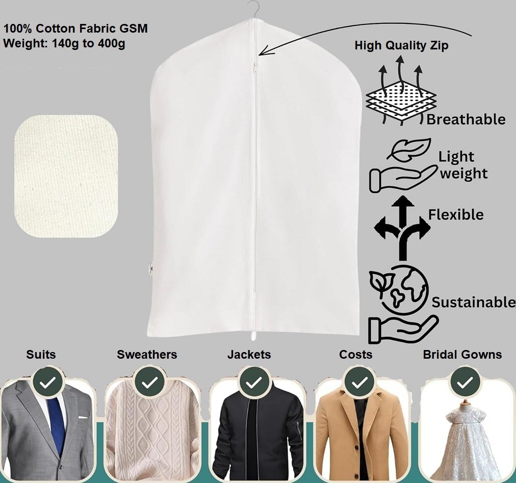 Suit Bag, Coat Cover Bag, Preservation Bag and Garment Cover are made with Cotton Fabric, Canvas Fabric, Twill Fabric & Non Woven. These Suit Cover Bags are sturdy and durable, made cotton fabric to preserve your suits, jacket for dust. Cotton Suit Cover Bags are biodegradable, environmentally friendly and completely natural. Our Preservation Bags are ideal for storing Coats, Suits, Jackets, Shirts, Skirts, Blouses, Short Dresses & Sherwanis etc. There is a grommet provided at the bottom that can be looped over the hanger for easy storage and even transport. These Cotton Suit Bags & Garment Bags keep clothes safe from dust, and prevent the garment degrading quickly. It is easy to carry, store, and transport clothes with these covers. Sofar International offers custom hem colors as well as many choices buttons and Zip. Custom Printing and Tags are available.