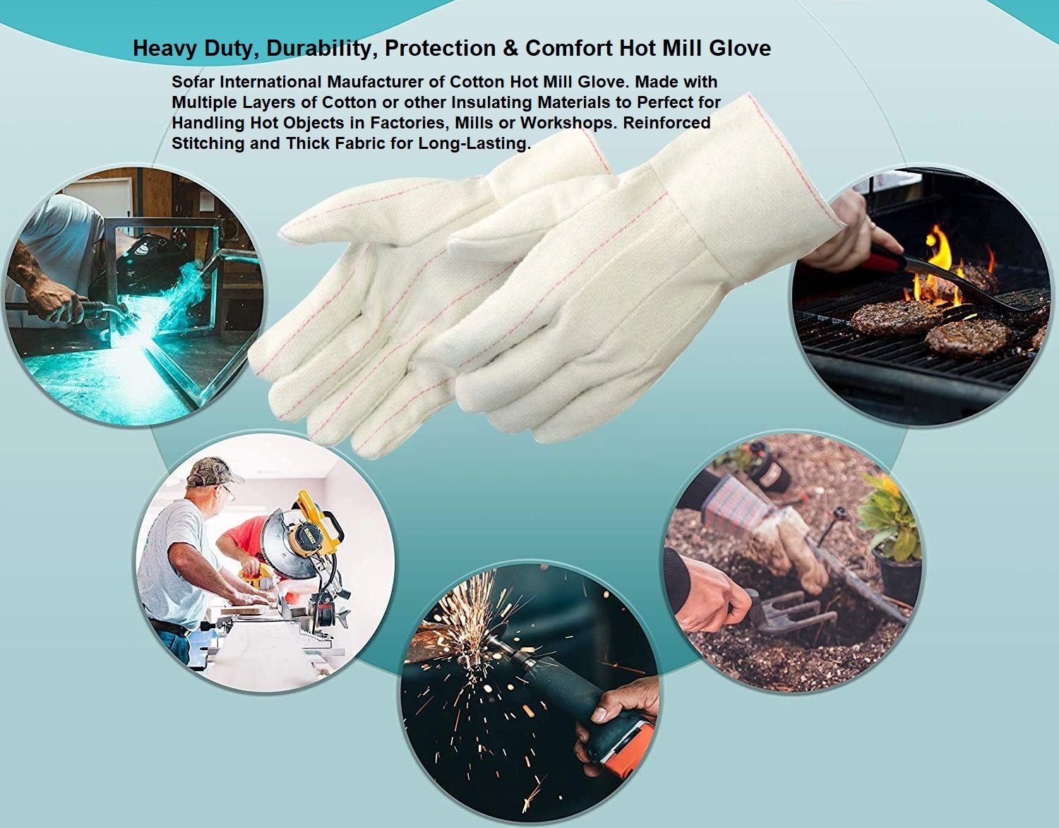 Hot mill gloves are heavy-duty, heat-resistant gloves designed for industrial and high-temperature environments. Hot Mill Gloves are commonly used in metal working, foundries, glass handling, welding, rubber factories, bakeries, Bar B.Q, restaurants & hotels and other high-heat applications. Made with multiple layers of cotton or other insulating materials to protect against heat Reinforced stitching and thick fabric for long-lasting us. Cotton material allows airflow while providing heat resistance Available in knit wrist, gauntlet, or band top cuffs for different protection levels. Keep Your Workers Safe And Your Projects Moving with our Glove & Mitten