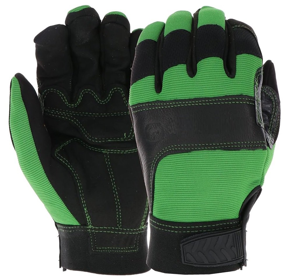Features: Double stitched synthetic leather reinforcements on palm, saddle and fingers Rubberized knuckle impact protection