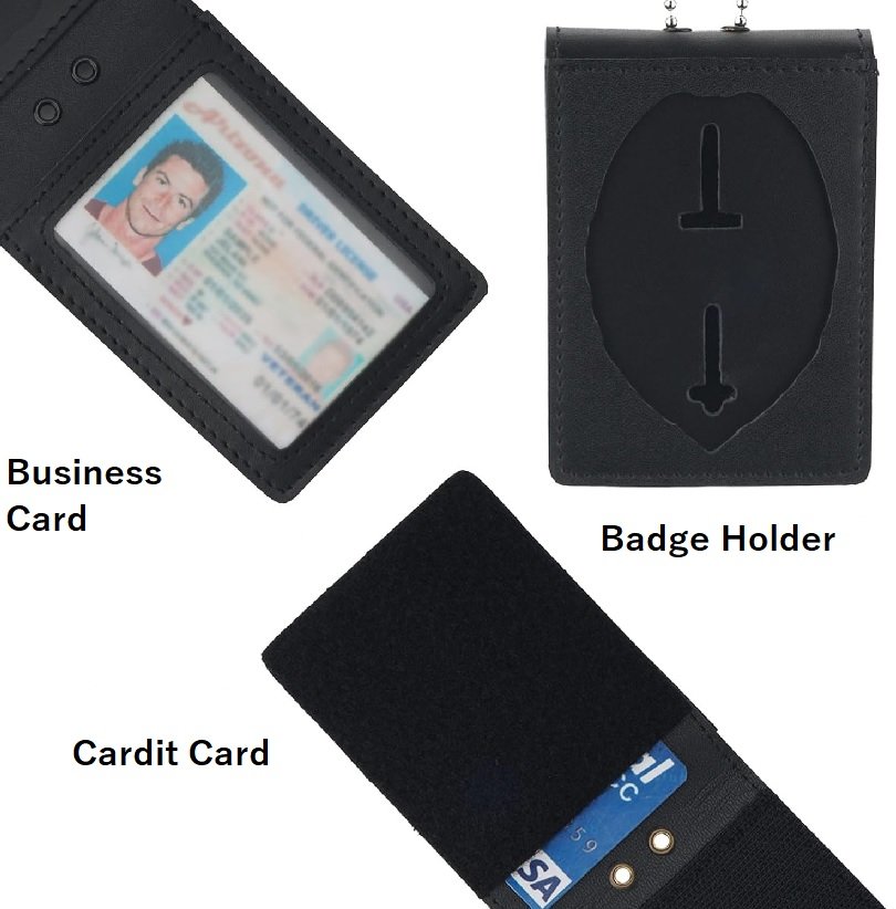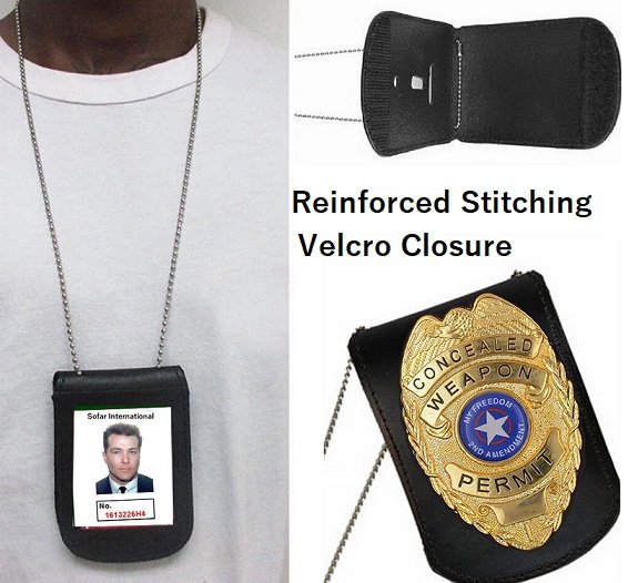 Black Full Grain Leather Neck Chain Police Badge and ID Holder with Extra Hidden Inside ID Card Storage Holds Metal Badge on the front and a photo ID on the back · ID window on the back holds credit card